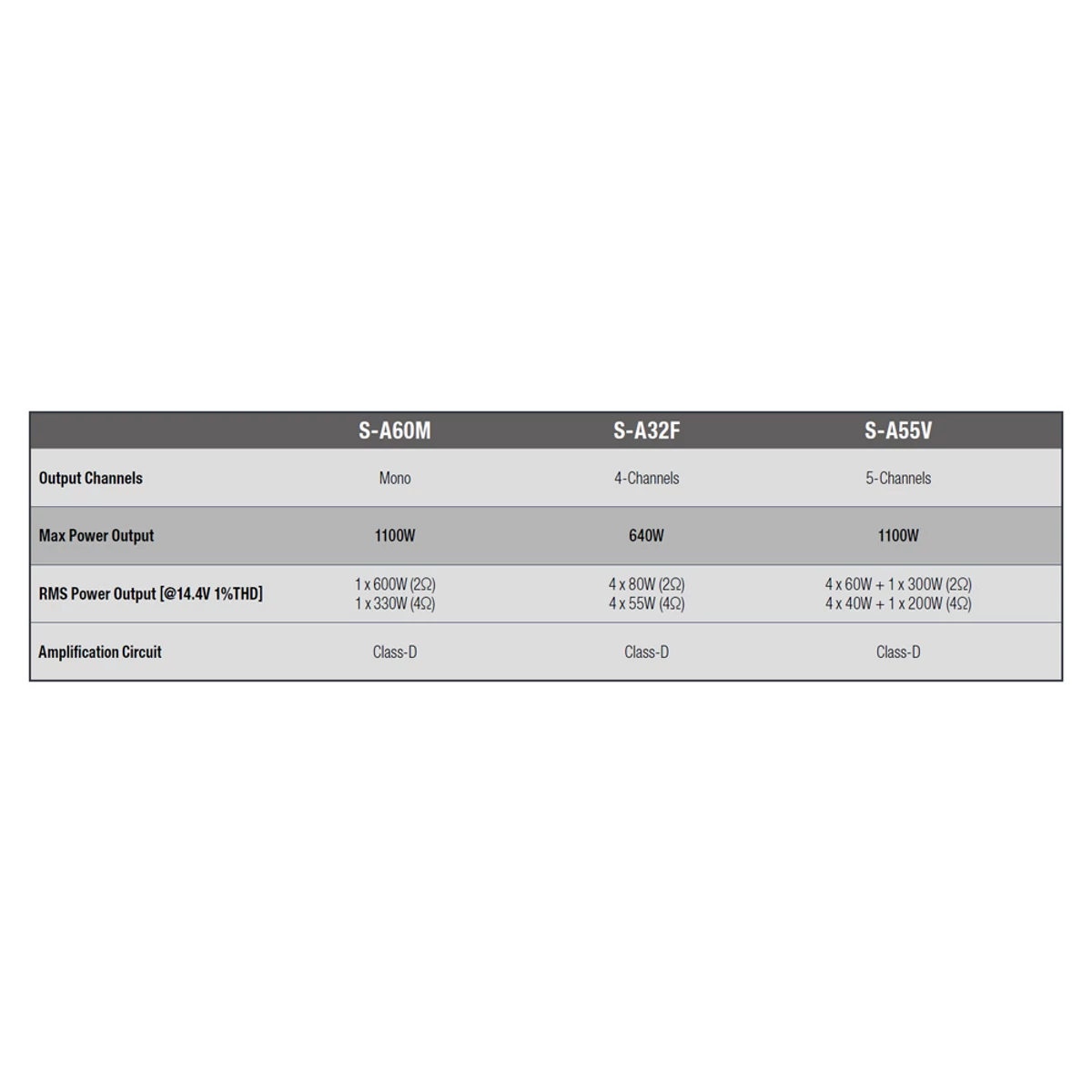 Az Alpine bemutatja a vadonatúj S-sorozatú erősítőket – amelyek tökéletesen illeszkednek az S-sorozatú hangszórókhoz. Ezek az erősítők kiváló watt/forint arányt mutatnak a D osztályú kategóriában, nagyon magas hőállósággal rendelkeznek, és nem kapcsolnak ki túlmelegedés miatt. Árkategóriájukban kiváló hangminőséggel rendelkeznek. Az S-sorozatú erősítők monó, 4 csatornás és 5 csatornás konfigurációban kaphatók.