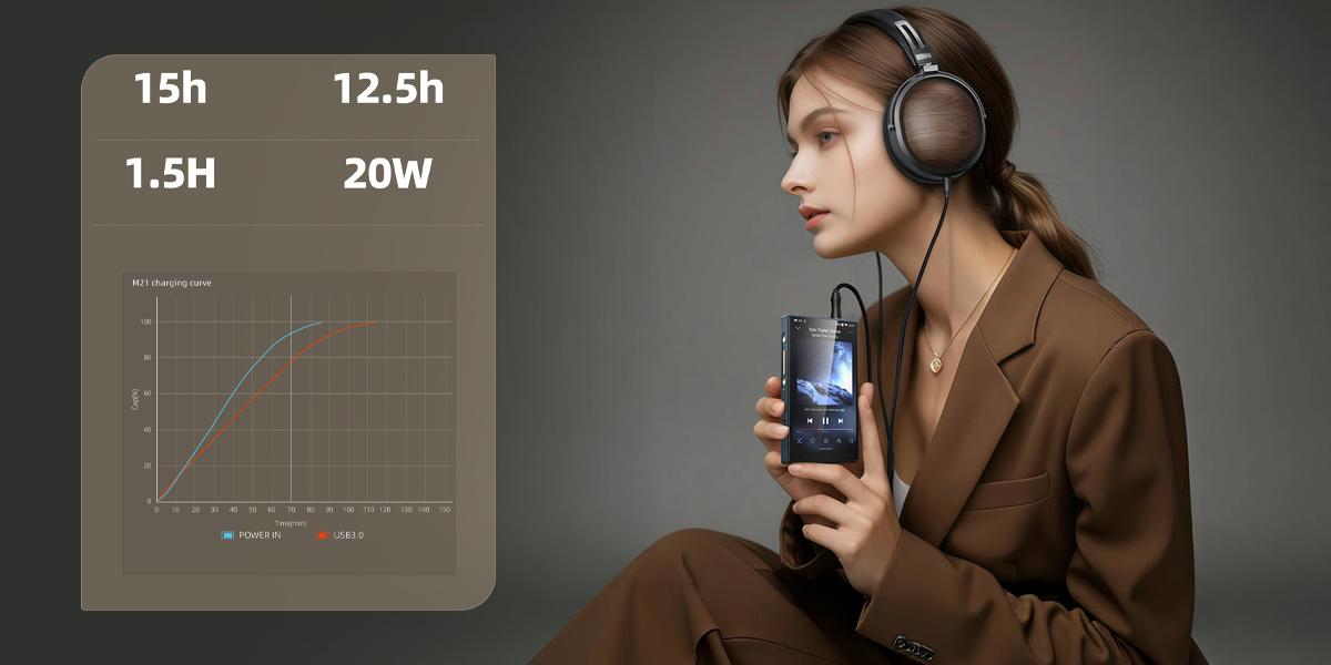 Az M21 4000 mAh-s akkumulátorával akár 15 órán keresztül élvezheted a kedvenc zenéidet egyetlen töltéssel. Ha lemerült a lejátszód, akkor azt egy gyorstöltő segítségével rövid időn belül feltöltheted. A lejátszó alján dedikált tápfeszültség csatlakozót találsz, így akkor is élvezheted az asztali módot, ha a másik USB csatlakozón keresztül érkezik a digitális jelfolyam az M21-be.