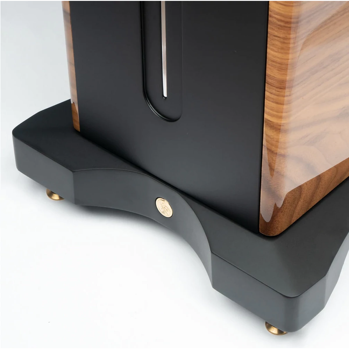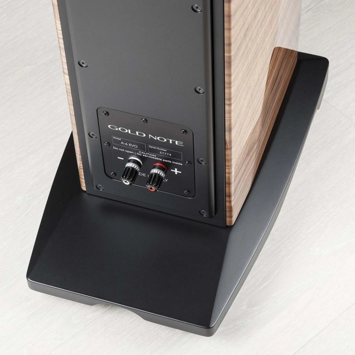 A mélysugárzó testreszabott, fémházzal rendelkezik, a padlóra van irányítva, és egy masszív és elegáns faállványba van belehelyezve, alsó basszusreflex csatlakozóval, amely biztosítja a legjobb teljesítményt, hatékonyságot.
