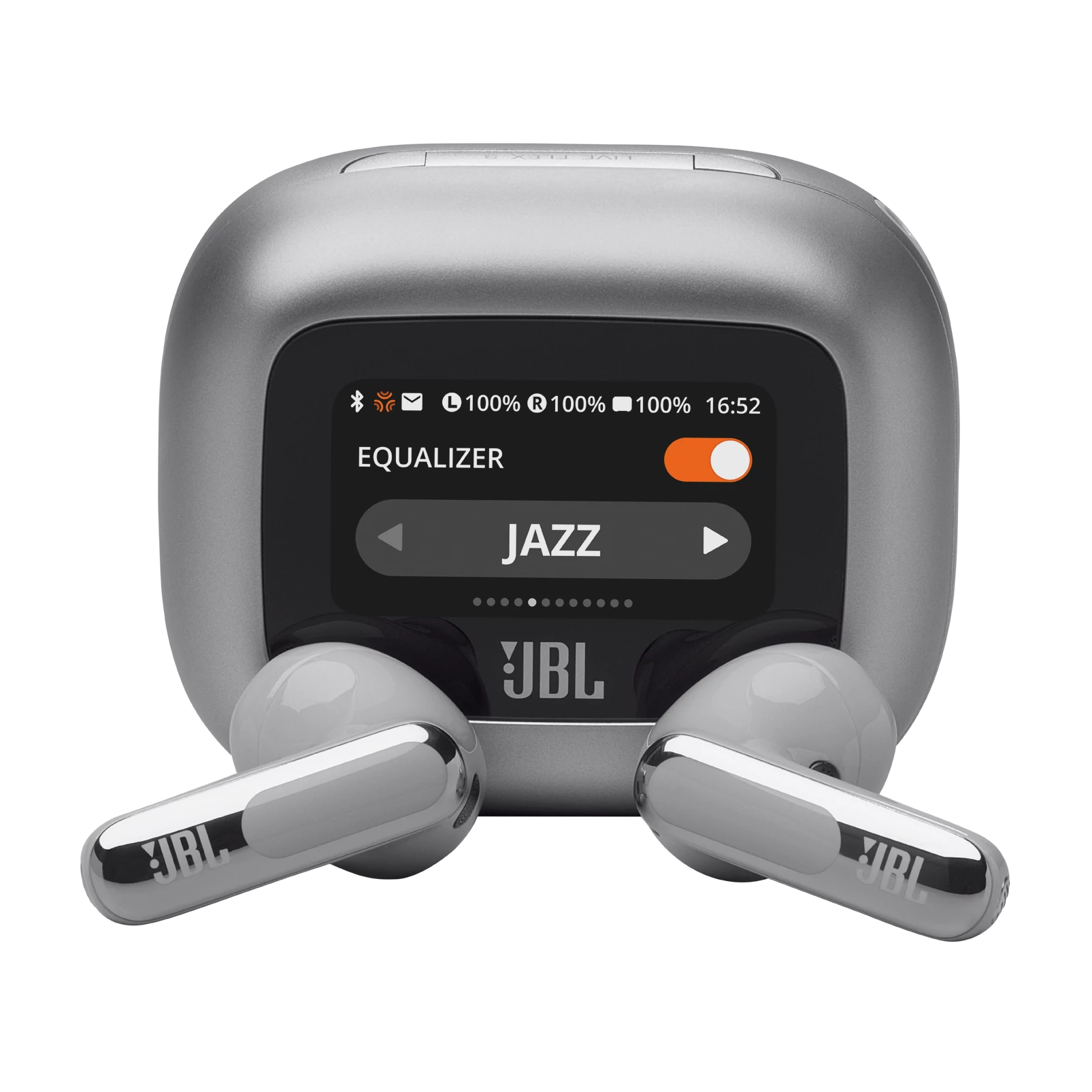 A Smart Charging Case™ 1,45 hüvelykes érintőképernyővel a JBL Live Flex 3 fülhallgató minden elemét személyre szabhatja. A kijelző teljes irányítást biztosít a hangzás felett bármilyen eszközön – laptopon, TV-n, okostelefonon vagy tableten – anélkül, hogy hozzá kellene nyúlnod a telefonodon a JBL alkalmazáshoz.