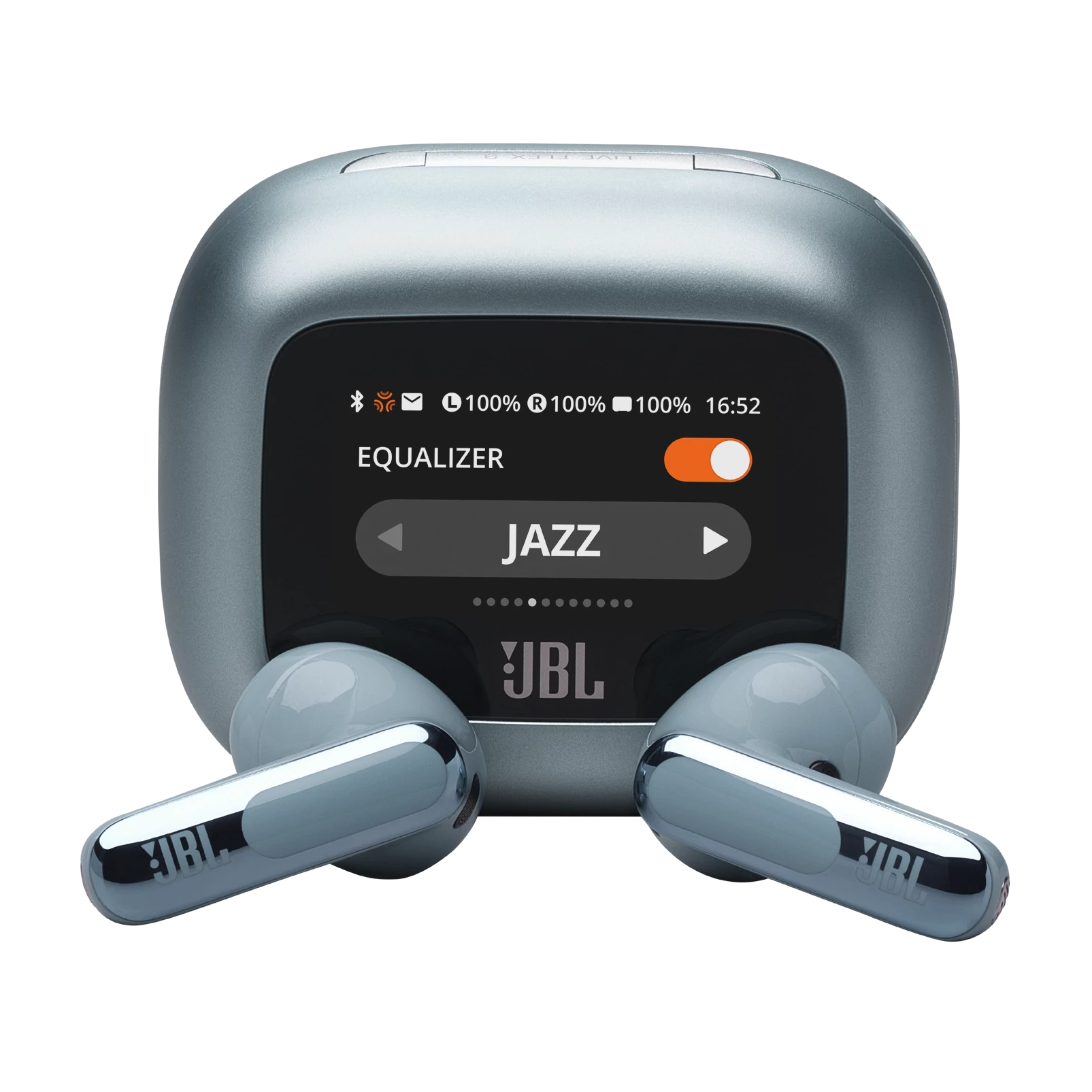 A Smart Charging Case™ 1,45 hüvelykes érintőképernyővel a JBL Live Flex 3 fülhallgató minden elemét személyre szabhatja. A kijelző teljes irányítást biztosít a hangzás felett bármilyen eszközön – laptopon, TV-n, okostelefonon vagy tableten – anélkül, hogy hozzá kellene nyúlnod a telefonodon a JBL alkalmazáshoz.