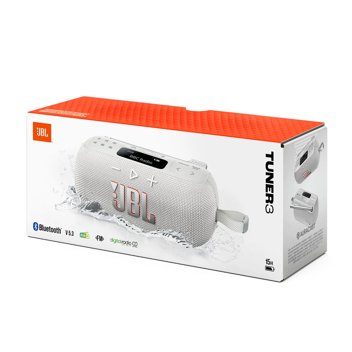 Hangolódj a mókára, és merülj el egy magával ragadó új rádióélményben! Nagy teljesítményű, hordozható JBL Tuner 3 rádiónk a kedvenc DAB/DAB+/FM rádióállomásainkra és Bluetooth streamingre hallgatható, merész, kristálytiszta JBL Pro hangzást biztosítva a konyhában, a medence mellett, a kempingben, vagy bárhol, ahová a hangulat szólít. Tudjuk, hogy ez a zenehallgatás élményét felemeli. Készülj fel a hangerő feltekerésére! Megnöveltük a teljesítményét, így a praktikus JBL Tuner 3 elég hangos ahhoz, hogy bármilyen teret tiszta, élethű hangzással töltsön meg. Ez a valaha volt legerősebb rádiónk. Állítsd be a hat kedvenc állomásodat, hogy mindig kéznél legyenek. Szeretjük felfedezni a rádióhullámokat, hogy lássuk, milyen meglepetések tartogatnak a nagy, tiszta LCD kijelzőn. Akárhogy is, akár 15 órányi zenehallgatást kapsz a Playtime Boost segítségével, mielőtt töltésre lenne szükséged. Vidd magaddal bárhová, beltéren vagy kültéren, a masszív hurok segítségével. Akár a fürdőszobai mosdókagylónál, akár egy homokos tengerparton hallgatod, a vízálló és porálló kialakítás szinte bármivel megbirkózik. Találd meg a saját új állomásodat a JBL Tuner 3-mal.