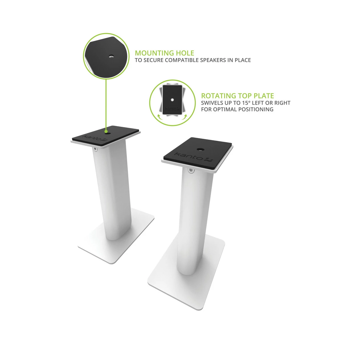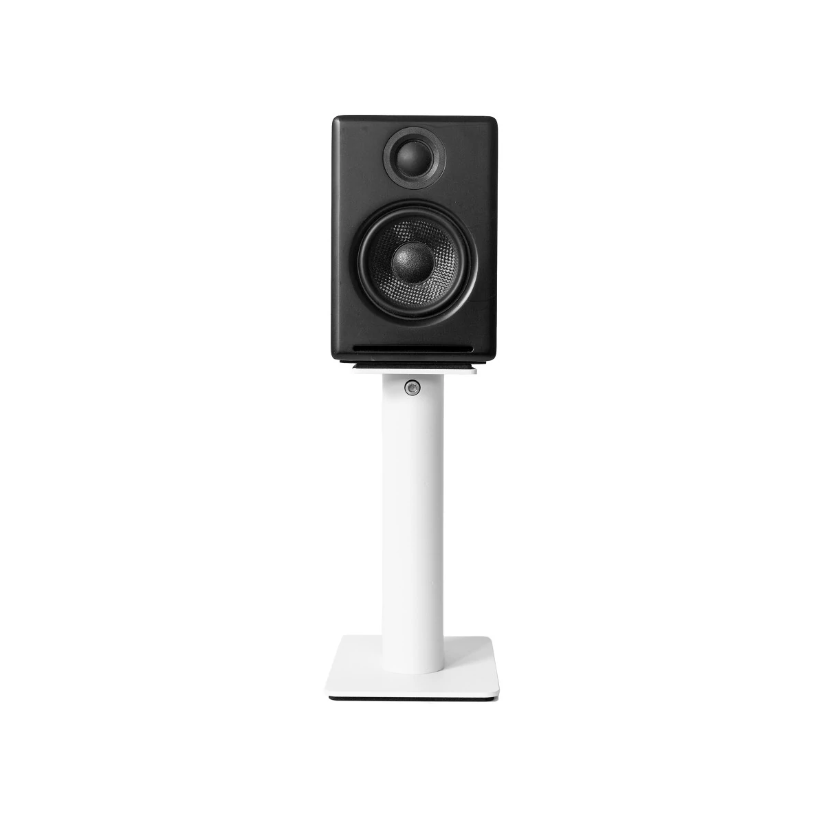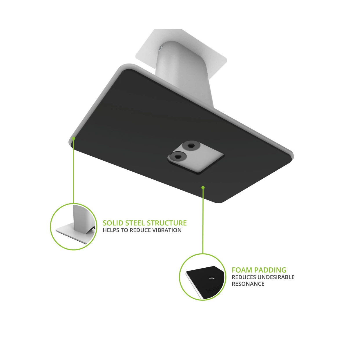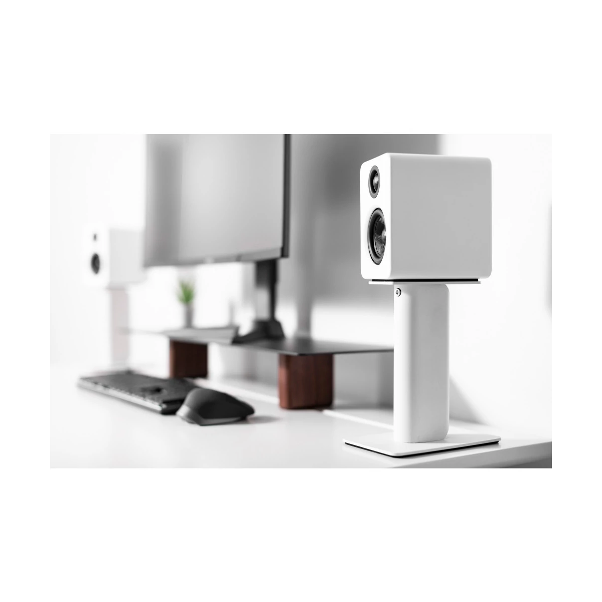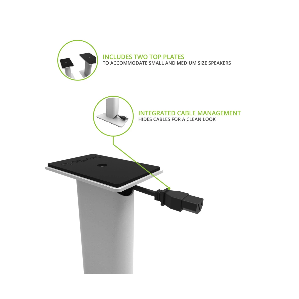Az SP9 állvánnyal fülmagasságba emelheted asztali hangfalaidat. A nehéz acél szerkezet és a zártcellás hab felületű talpak és hangfaltálcák csökkentik a nemkívánatos rezonanciákat. Hangfaltálcák 30°ban elforgathatóak, hogy a hangszórókat jobban magad felé irányíthasd, miközben az asztalon a talpak párhuzamosak maradnak, jobban illeszkedve az íróasztlonhelyet foglaló egyéb tárgyak helyigényéhez. A hanszórótálcákat a gyártó csavaros hangfalrögzítéshez is előkészítette, hogy még stabilabban rögzíthesd kedvenc hangfalaidat. A lábak belsejében pedig kábelvezető csatorna van, a nagyobb rend érdekében.