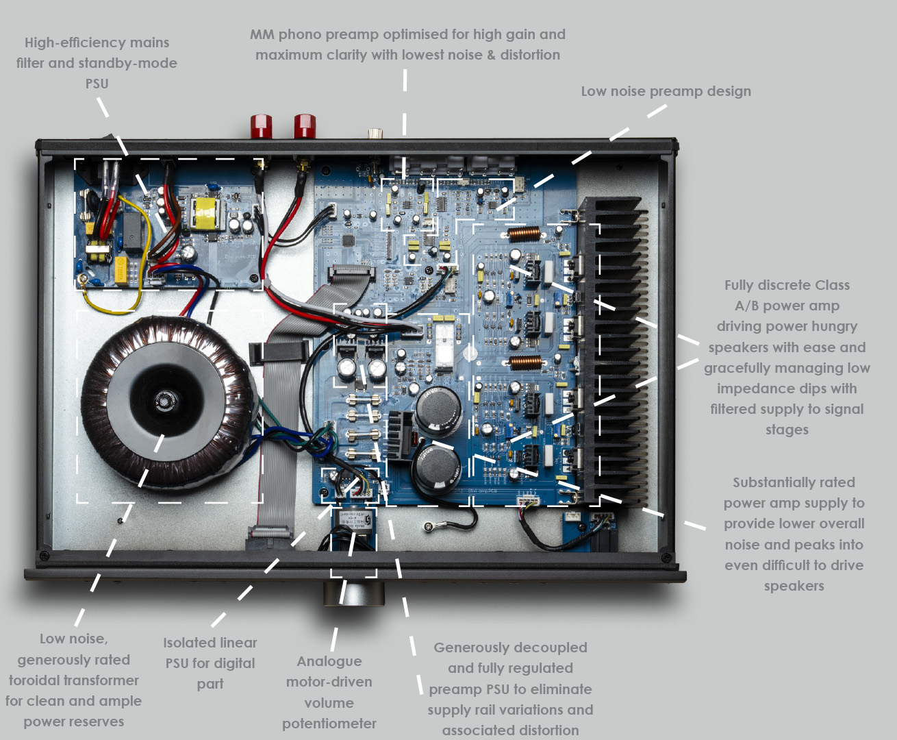 Az előerősítő rész saját, dedikált lineáris tápegységgel rendelkezik – ritkaság az integrált konstrukciókban. Ez az elválasztás ultraalacsony zajszintet és kiváló csatornaszétválasztást biztosít, vetekszik a high-end elő-/teljesítmény elválasztókéval. A hangerőszabályozás egy motoros analóg potenciométerrel történik, megőrzve a jel tisztaságát – ellentétben sok modern digitális hangerőszabályzóval, amelyek a jelfelbontás csökkenése miatt rontják a hangminőséget. A lemezrajongók értékelni fogják a B1xi kivételesen alacsony zajszintű, nagy nyereségű lemezjátszó előerősítőjét. A muzikalitásra és a részletekre gondosan hangolt rendszer a legjobbat hozza ki MM hangszedőkből elszíneződés vagy torzítás hozzáadása nélkül.