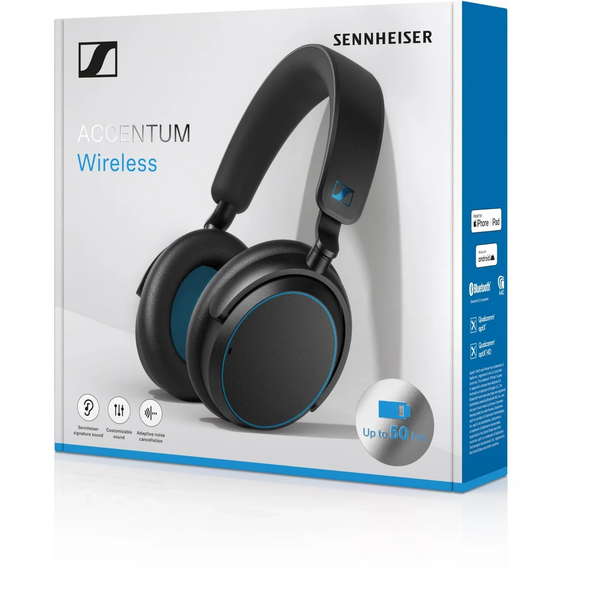 Az akkumulátor élettartama Akár 50 óra lejátszási idő Bluetoothon keresztül és ANC-vel (tesztkörülmények:iPhone, közepes hangerőszint)