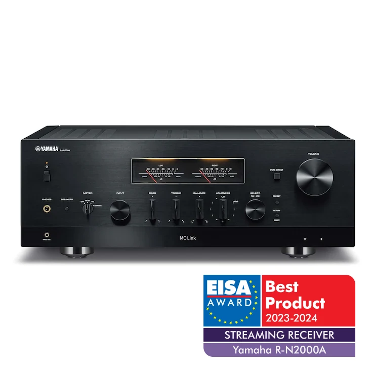 "A japán kézművesség és a hifi hagyományok ötvözve a legmodernebb digitális technológiával biztosítják, a Yamaha R-N2000A streaming receiver lélegzetelállító és innovatív mivoltát. A vintage ihletésű előlapon hagyományos VU-műszerek és fizikai kezelőszervek találhatók, ezeket egy elegáns OLED-kijelző egészíti ki, amely egyrészt segít a funkciók között eligazodni, másrészt egyszerűsíti a navigálást. A Yamaha kiváló MusicCast alkalmazása biztosítja a streaming lehetőségeket és a multiroom funkcionalitást, de a tévé és a lemezjátszó, valamint az FM rádió számára is vannak bemenetek. A Yamaha kipróbált és bevált erősítő technológiája kifinomult teljesítményt nyújt, a finom részleteket széles és mély hangszínpadra festi. A Yamaha YPAO szobakorrekciója különösen üdvözlendő, alkalmazásával ez az erősítő minden helyiségben a legjobbat képes nyújtani." - EISA.EU